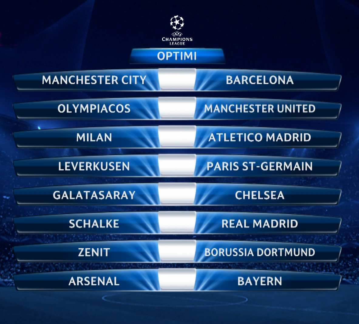 Programul optimilor de finală, conform tragerii la sorţi care a avut loc la Nyon. 1. Manchester…