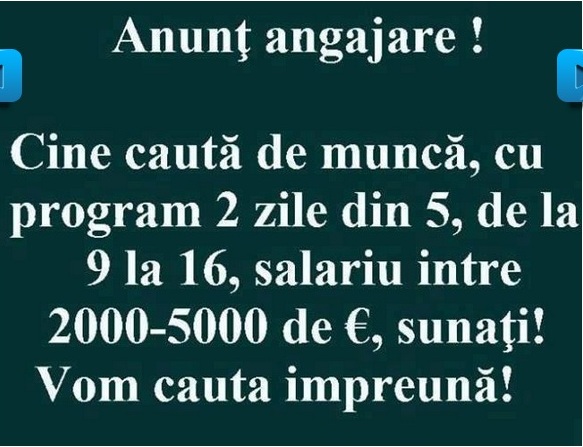 Anunt de angajare!!! 0 By Adrian Manolache on Noiembrie 10, 2013 divertisment Anunt angajare!! Cine cauta de munca, cu program 2 zile din 5, de la 9 la 16, salariu intre 2000-5000 de euro, sunati! Vom cauta impreuna! Puteti citi si..: Job de criza: mancator profesionist Share. Twitter Facebook Google+ Pinterest LinkedIn Tumblr Email